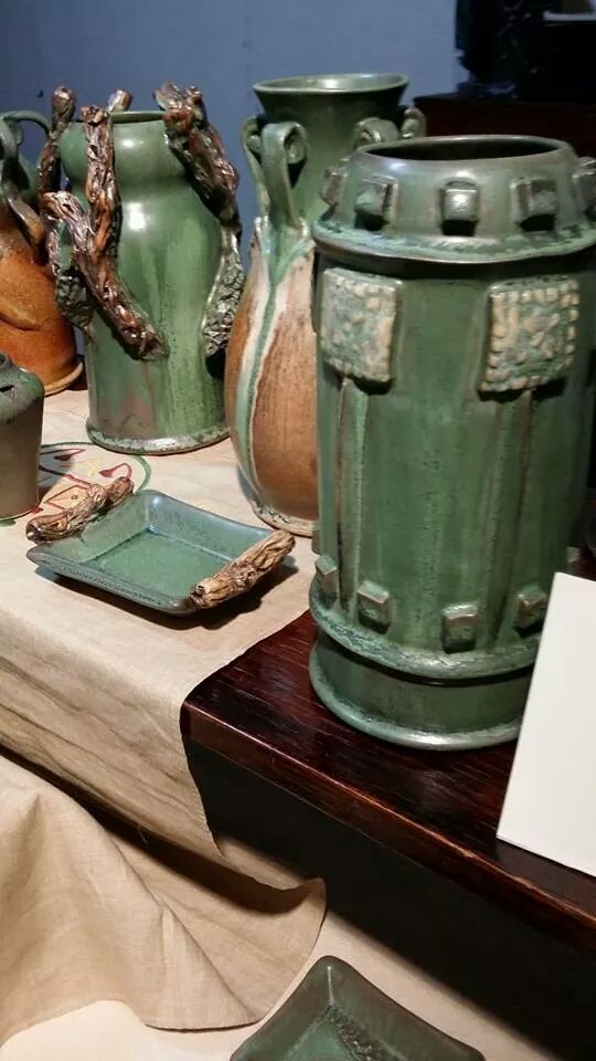 On left vase with branches and pine cones. Center vase is a vase with fiddle head fern fronds unfurling.