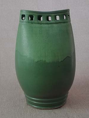 Description: Tall bulbous wheel thrown vase with an altered oval shape at the top, although round at the multi-banded foot of the vase. Near the top are rows of different cutout “windows” that are on each side of the oval rim. The cutout shapes are squares, circles and triangles. The glaze is accomplished by two applications that create the semi-matte green color. The second glaze applied causes the flowing/drip effect and may have subtle black striated undertones.
