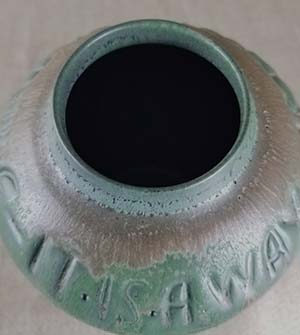 Glaze: Green drip semi-matte glaze with tan overtones at top and black undertones in green glazing. A touch of blue at the rim.