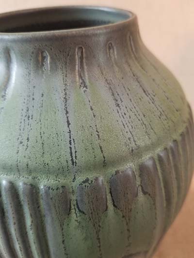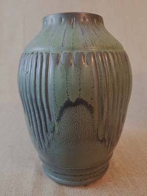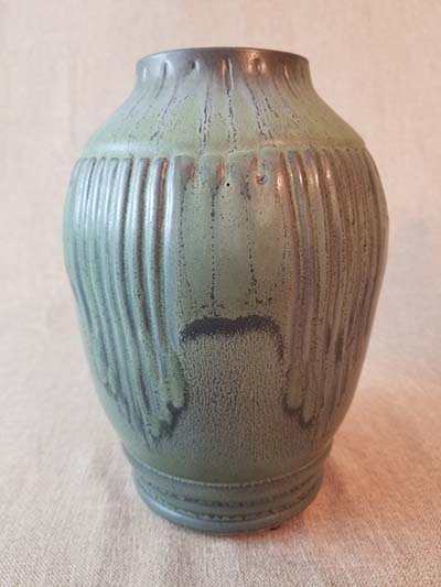 Comments: This vase was inspired by “Espanol” line of pottery from Newcomb College circa 1920 which was commonly in a darker blue glaze often with the glaze drip pooling in a paler blue/white variation. My vase is uniquely diverse although you can see the inspiration in the perpendicular incising defined by the green glaze dripping and pooling into black glaze.