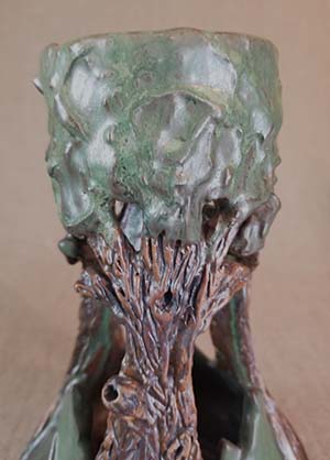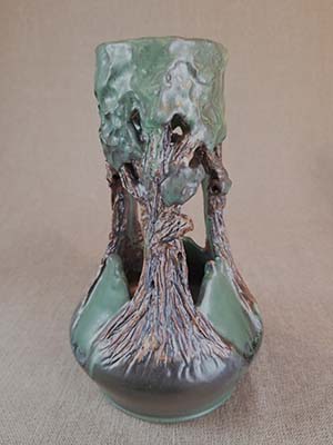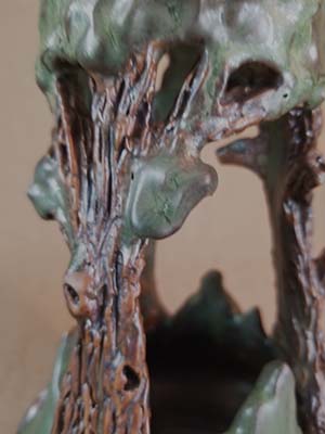 Description: Cut-out form made form a wheel thrown vase. Scored for faux-bois work and added slip at top of form to create a canopy of tree leaves.