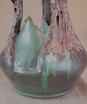 Steve’s Comments: This is the second cut away vase of this style. I throw the vase and then cut away a lot of clay to create three tree trunks that support the top of the vase, which will be the leaves at the tree tops. This is time consuming carving. The clay is still wet, somewhat weak and supporting the top until it hardens. Then the trunks are scored to look like tree trunks and when glazed I use stains and oxides for the glazing for the faux-bois (false wood) glazing. The rest of the vase is glazed with a green flowing drip combination applied with two glazes one on top of the other. Many people ask if it is a candle lantern. When I made this I did not have that intention, I just started carving away at the thrown vase. Often I just let my artistic expression flow as I am working on a piece, sometimes not knowing where it will take me!