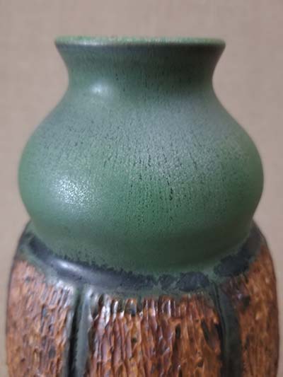 Steve’s Comments: This vase has an interesting gourd shape in the neck treatment and overall shape including the panels around the vase that imitate a gourd’s ribbing. It is experimental in my faux-bois (false wood) treatment creating the seven wood-like “panels.” Most of my previous faux-bois work was creating tree branches as handles or decoration. For those who like the tactile experience of a vase there is a distinct difference in the textural feel of the vase, the green smooth matte finish contrasting with the rough wood like texture of the faux-bois panels. During the firing the clay is converted to vitrified ceramic and therefore will hold water for fresh flowers. A mission oak table will make a good pairing for this gourd.