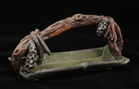 Green drip vase with attached fiddle head fern handles at top lip of vase. “Live, Love Laugh” incised around top of vase between fern handles.