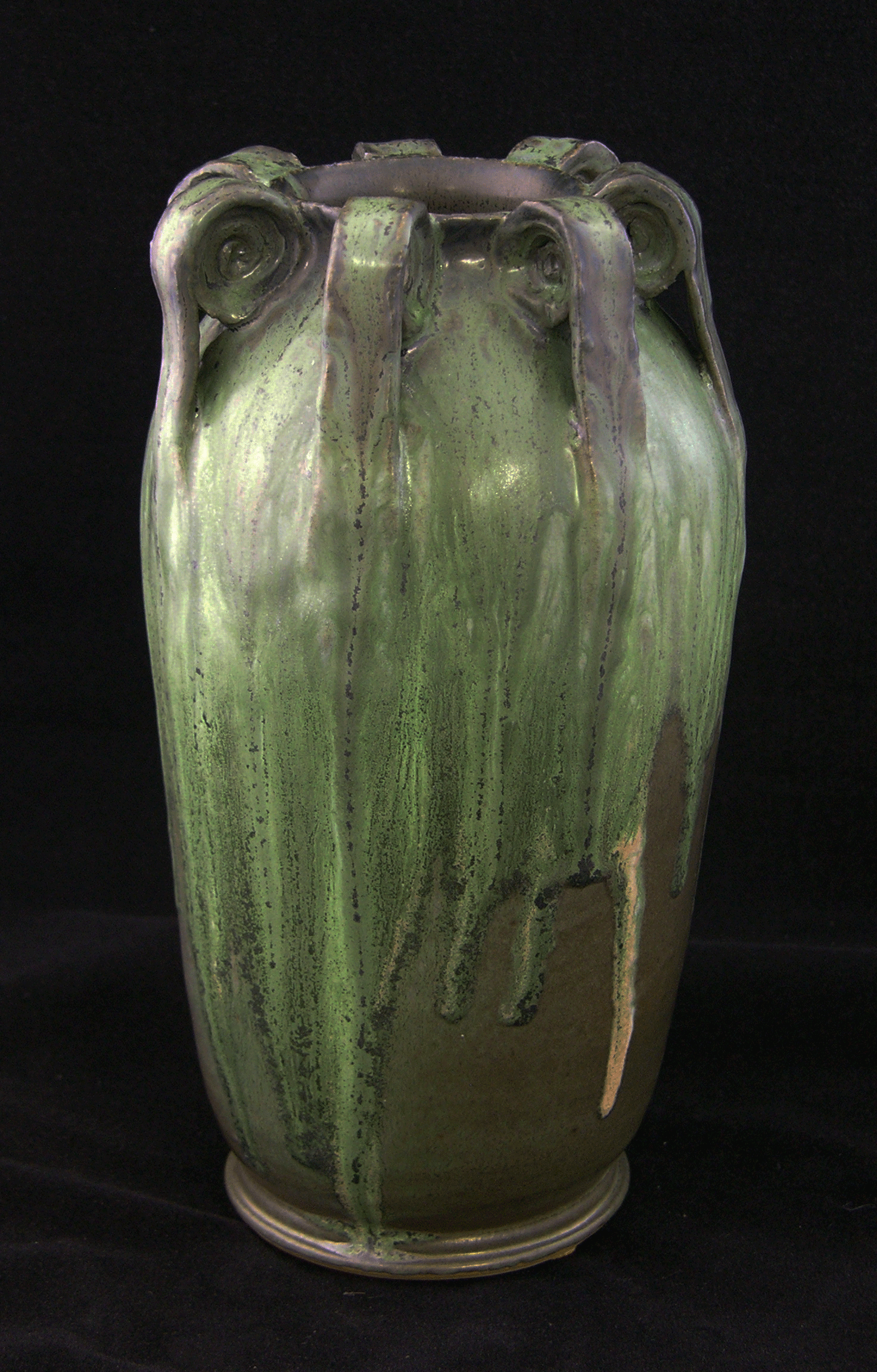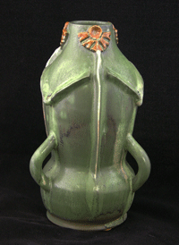 Green and brownish art pottery vase with attached fiddle head fern design around top lip, swirl pattern to lower fern leaf attachments.