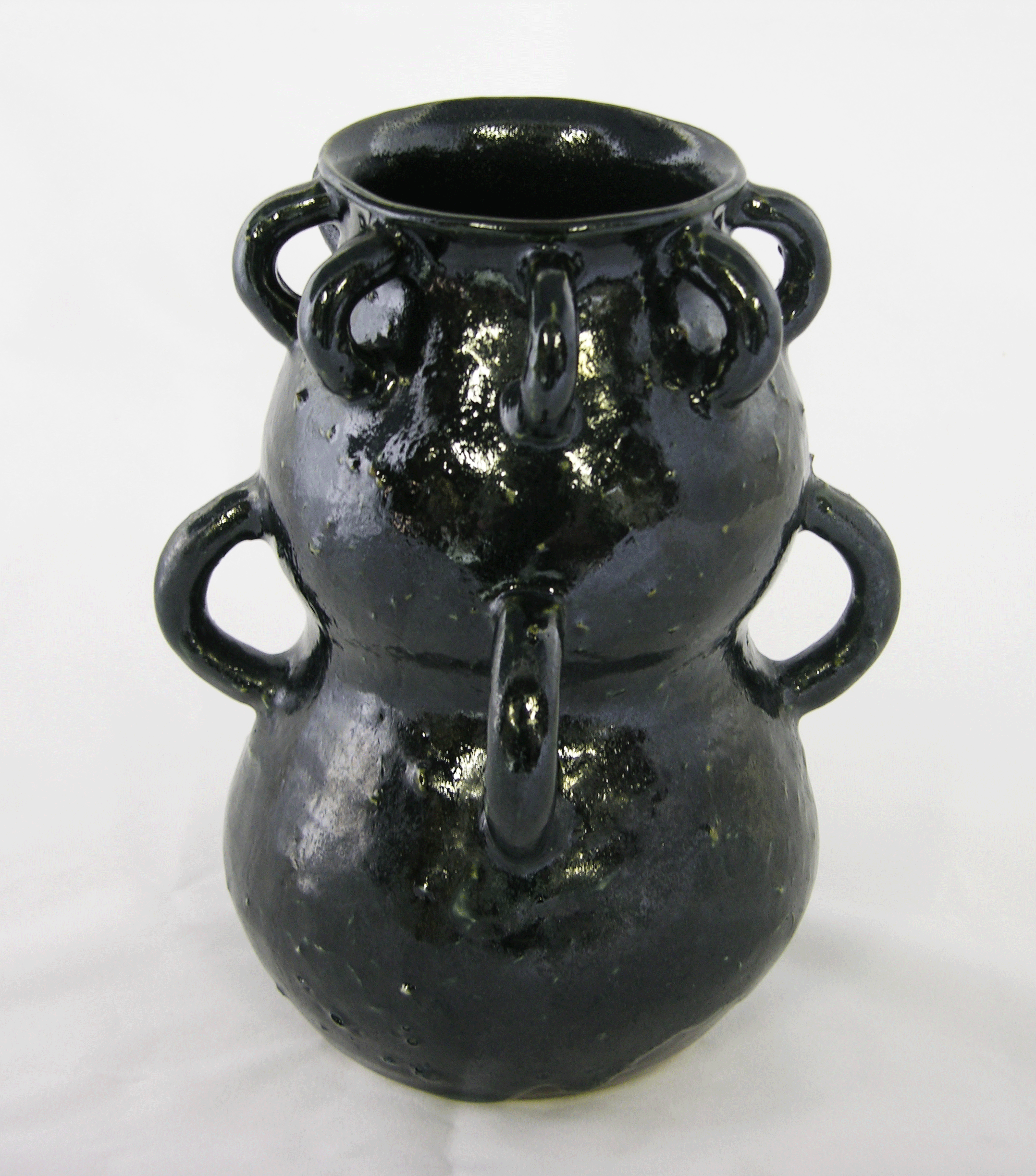 Guord vase with dark black/blue glaze. 12 handles at top and center.