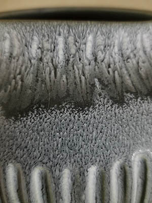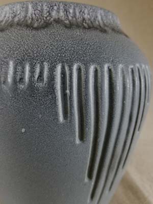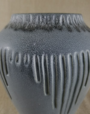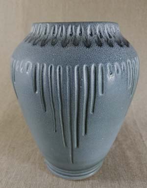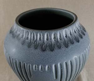 Description: Wheel thrown bulbous vase with a blue glaze, mostly flowing/drip and striated near the top of the vase. Incised small vertical marks around top near rim. Midway down from rim are five sets of 9 vertical downward incised lines, graduating in length from the center longest line. Smaller vertical incised lines are between each of the 5 graduated sets.
