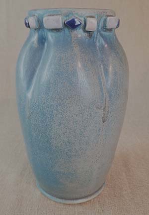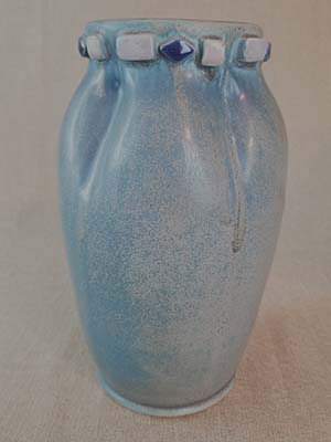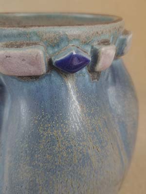Glaze: Blue mottled semi-matte with tan overtones. Added shapes have variations of the blue spectrum.