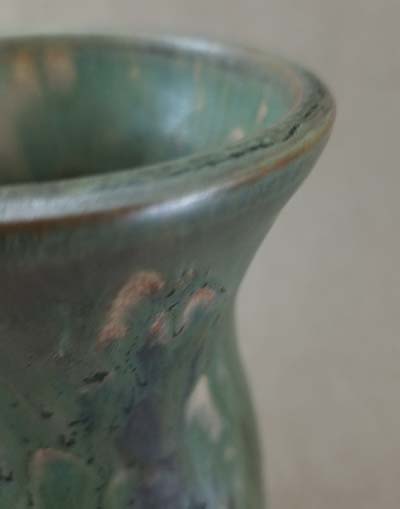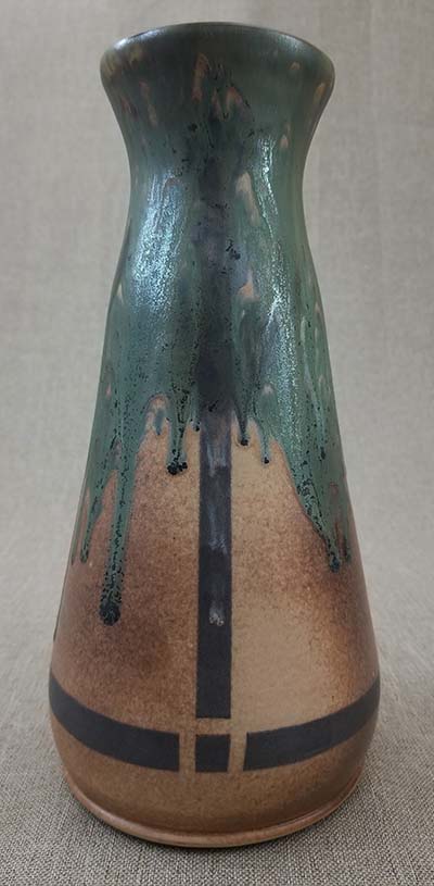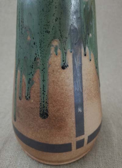 Glaze: Mottled tan with dark brown striping, green flowing glaze from the top of the vase.