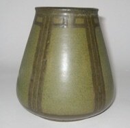 My vase uses three bold dark brown vertical lines as conventionalized tree trunks and the horizontal banding along the bottom as a representation of the ground. The glaze base color is a mottled brown, and at the top I over coated with a flowing green drip glaze representing the weeping leaves of the tree.
